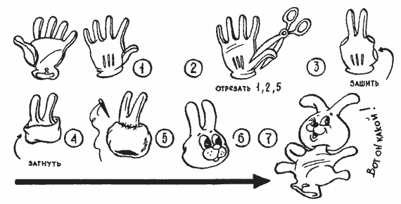 Одну перчатку оставьте нетронутой – чуть позже вы наденете ее на руку. Из второй же смастерите головку Зайчишки. Отрежьте у перчатки пальчики 1, 2 и 5 и зашейте прорези. Загните края перчатки до основания пальцев, вытянув 3 и 4 пальцы кверху. Это будут уши. Сшейте перчатку как показано на рисунке. Получилась головка. Пришейте к ней глазки-пуговки, носик, ротик (их можно вышить). Теперь пришейте головку к среднему пальцу первой перчатки (см. рис.). Получится очень выразительная перчаточная кукла, которая может шевелить головой, дрыгать четырьмя лапами (соответственно четыре пальца), чесать у себя за ухом и проделывать множество других забавных движений. Ребенку почти наверняка захочется надеть ее на руку и поиграть.