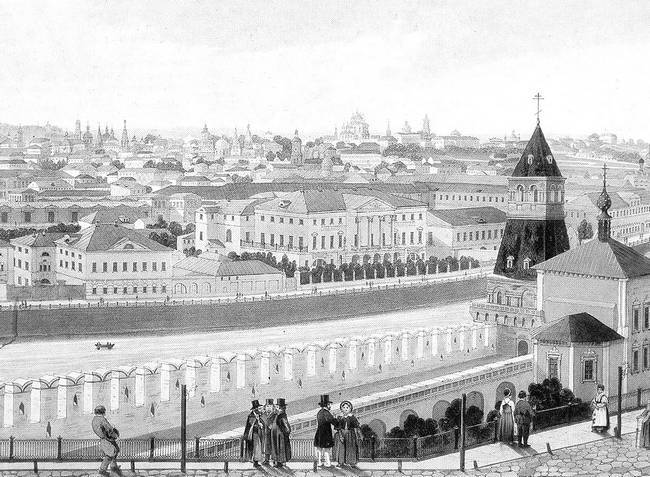 Угрюмые годы царствования Павла I миновали быстро и не отразились на внешнем виде Москвы, если не брать во внимание появившиеся в огромном количестве особняки дворян, попавших в немилость чудаковатого императора и высланных из Петербурга. При Александре I в московской архитектуре господствовал александровский классицизм, или русский ампир. Рубежным этапом развития Москвы стало нашествие Наполеона 1812 года. Но до него Александр Павлович успел и сам немного отчистить Кремль от старых строений. В 1803–1806 годах были сломаны дворцовые здания, выдвигавшиеся к Троицким воротам, и Троицкое подворье с церковью Богоявления. В 1810 году на месте дворца Бориса Годунова построили Оружейную палату.