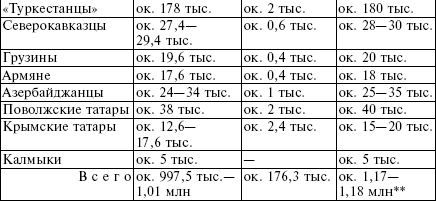 ** Приведенные общие цифры касаются только тех добровольцев из числа граждан СССР, наличие которых подтверждается документальными источниками. Однако, кроме этих добровольцев, набранных централизованно, было еще около 200 300 тыс. человек, которые в индивидуальном порядке или небольшими группами входили в состав немецких частей и соединений. Если же учитывать и этих добровольцев, то как раз и получится цифра в 1,3 1,5 млн граждан СССР, проходивших службу в составе германских силовых структур.