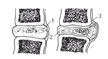 Рис. 15. Потеря тонуса диска, его выпячивание и перестройка формы углов тел позвонков при хондрозе: 1 – нормальный, но более высокий, чем а норме, поясничный диск; 2 – диск при снижении его тонуса; 3 – перестроенная форма угла тела позвонка