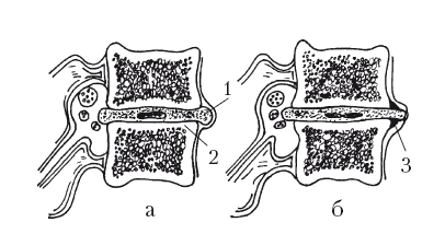 Рис. 18. Развитие остеохондроза: а – уменьшение высоты диска, субхондральный остеосклероз; б – краевые костные разрастания вдоль выстоящего диска. 1 – выстоящий диск; 2 – субхондральный остеосклероз; 3 – остеохондрозный остеофит