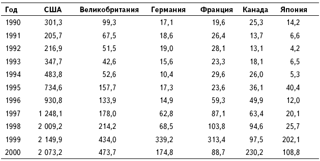 Пятая волна слияний была поистине международной (см. рисунок 1.3). Как видно из рисунка 1.1, начиная с 1996 г. долларовое значение и количество сделок в Соединенных Штатах значительно увеличились. В Европе пятая волна отчетливо проявилась начиная с 1998 г. В 1999 г. стоимость сделок в Европе была почти столь же велика, как и в США. Наибольшее число европейских сделок приходилось на Великобританию, за которой следовали Германия и Франция (см. таблицу 2.9). В Азии стоимость и количество слияний также заметно увеличились начиная с 1998 г. Большинство этих сделок совершалось в Японии. Объем сделок в Канаде рос стабильно на протяжении всех 1990-х гг., но более чем удвоился в 2000 г.