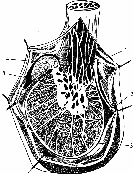 Рис. 1. 1 – яичко; 2 – придаток яичка; 3 – кожа; 4 – белочная оболочка яичка; 5 – средостение яичка
