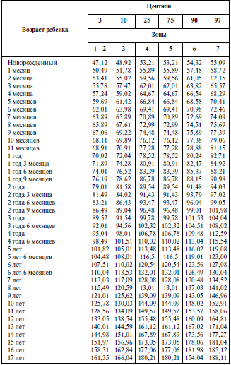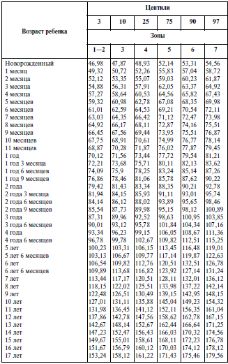 Должные антропометрические данные определяют путем анализа процентного распределения значений признаков в соответствующей возрастно-половой группе здоровых детей. Оценка проводится по таблицам центильного типа. Колонки центильных таблиц показывают количественные границы признака у определенной доли или процента (центиля) здоровых детей данного возраста и пола. Интервалы между центильными колонками (зоны, коридоры) отражают тот диапазон разнообразия величин признака, который свойствен или 3 % (зона до 3 и от 97 центилей), или 7 % (зона от 3 до 10 или от 90 до 97 центилей), или 15 % (зона от 10 до 25 или от 75 до 90 центилей), или 50 % всех здоровых детей возрастно-половой группы (зона от 25 до 75 центилей). Границы центильных групп и номера центильных интервалов (зоны) представлены в верхних строках каждой таблицы (см. табл. 1,2,3, 4). Задача врача – найти, в какой центильный интервал (зону) попадает полученная величина измерения, и записать как саму величину, так и центильный интервал в медицинский документ ребенка. В зависимости от этого формируется оценочное суждение: