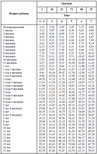 Таблица 2. Дентальные величины массы тела (кг) мальчиков от рождения до 17 лет