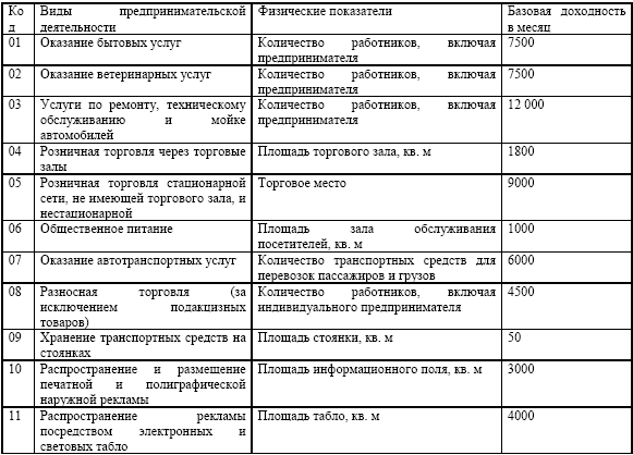 3) для исчисления суммы единого налога в зависимости от вида предпринимательской деятельности используются следующие физические показатели, характеризующие определенный вид предпринимательской деятельности, и базовая доходность в месяц, приведенные в таблице.
