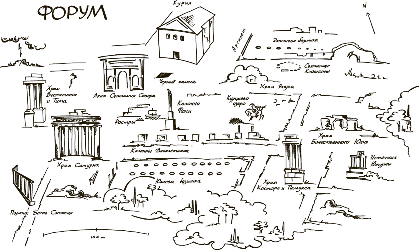 Во-первых, что такое римский Форум? Это довольно обширный прямоугольник, растянувшийся с запада на восток и ограниченный с запада холмом Капитолием, с юга – холмом Палатином, с севера – императорскими форумами (и названной в их честь Виа деи Фори Империали), а на востоке почти упирающийся в Колизей. Во многих книгах Форумом в строгом смысле считают только западную половину этого прямоугольника. Мы следуем этой традиции, и о памятниках Священной дороги рассказываем в следующей главе.