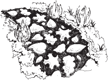 Далее выложить в подготовленные углубления при помощи шпателя бетонную смесь, после чего к ней надо аккуратно приложить лист растения рельефной стороной вниз. Необходимо выбирать листья несколько большие по размеру, чем подготовленные углубления. Для того чтобы узор прожилок лучше отпечатался на бетоне, можно поверх листьев положить какой-либо груз – например, камень или кирпич. Делать это нужно осторожно, так как груз может оставить отпечаток на еще не застывшем бетоне (рис. 6).