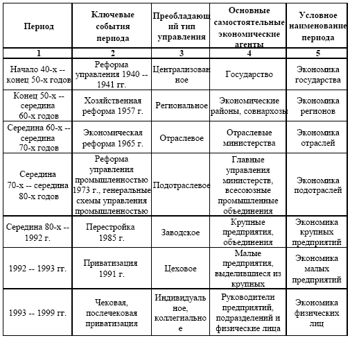 В современных экономических условиях необходим перенос центра тяжести реформ, не на словах, а на деле, с макроэкономического на реальный микроэкономический уровень. Следует отметить, что на протяжении длительного периода времени функционирования экономики отечественных предприятий предпринимались неоднократные попытки осуществления экономической реформы. Основные этапы развития экономики СССР и Российской Федерации представлены в таблице 1.1.