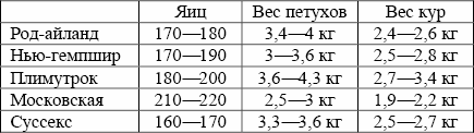 Яйценоскость – 210–220 яиц в год; масса одного яйца – 56–58 г. Живой вес курицы – 1,9–2,2 кг, петуха – 2,5–3 кг.