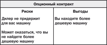 Машина, на которую вы купили опцион «колл», пользуется большим спросом, и цена на нее неожиданно подскакивает до 22 000 фунтов. Ваш приятель тоже хочет купить такую машину. Он слышал, что у вас есть недельный опцион на покупку этого автомобиля за 20 000. После посещения банка вы понимаете, что реально не можете позволить себе покупку машины, поэтому продаете приятелю свой опцион на покупку за 200 фунтов. Таким образом, дилер совершает продажу, ваш приятель получает машину, которую хотел купить, а вы зарабатываете на продаже своего опциона 100 фунтов. В этом случае вы спекулируете своим контрактом и получаете 100-процентную прибыль.