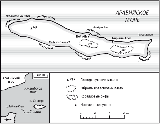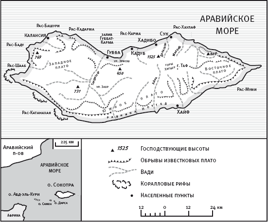Остров Сокотра занимает около 3650 кв. км; он вытянут с запада на восток на 133 км при наибольшей ширине 43 км. Это самый восточный остров одноименного архипелага. Его западная оконечность – мыс Рас-Ша‘6 – находится в 235 км от ближайшей точки африканского побережья. Расстояние между северо-западным выступом острова (мысом Рас-Башури) и южным берегом Аравии (мысом Рас-Фартак) – 345 км (илл. 1).