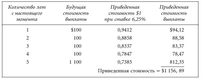 Вычисляя приведенную стоимость, мы предполагали, что будущая стоимость будет выплачена или получена раз в год. В реальной практике, между тем, будущую стоимость инвестор может получать чаще, чем раз в год. В подобной ситуации формулу, принятую нами для установления значения приведенной стоимости, следует уточнить. Во-первых, годовая процентная ставка делится на количество выплат в год. (В действительности такой метод уточнения величины процентной ставки не является корректным. Научно обоснованный метод уточнения данного значения приводится в главе 3.) Так, если будущие стоимости выплачиваются раз в полгода, годовая процентная ставка делится на 2; если они выплачиваются раз в квартал, годовую процентную ставку следует делить на 4. Во-вторых, число периодов, в течение которых инвестор будет получать будущую стоимость, должно быть уточнено путем умножения числа лет на количество выплат в год.