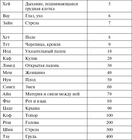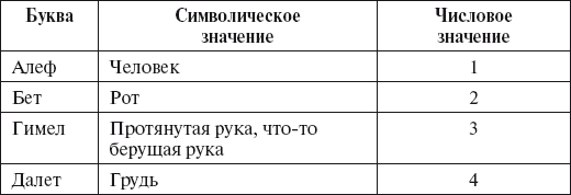 Ниже хотелось бы привести сводную таблицу, состоящую из букв еврейского алфавита, их символического (несколько другого, чем было описано выше) и числового значений.