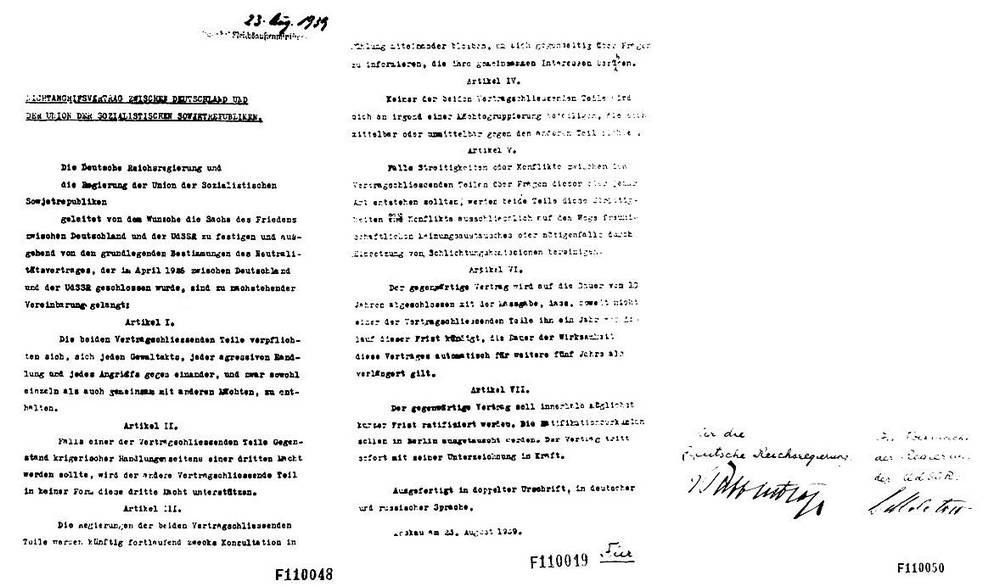 Фото 1. Немецкий текст советско-германского пакта о ненападении по микрофильму фон Леша. Обращает на себя внимание непоследовательная нумерация кадров (возможно, что на второй странице цифра «4» не пропечаталась, хотя это кажется маловероятным). Сомнительно и то, что третья страница договора не содержит ничего кроме подписей при том, что на страницах договора не видна нумерация. Так никогда не оформляются документы! В противном случае можно будет третью страницу договора подшить к любому тексту и утверждать, что его подписали Молотов и Риббентроп.