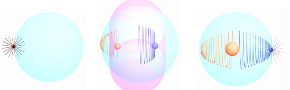 В фазовом объёме на полволны непрерывно происходит изменение магнитного поля от монопольного (слева) одного знака через дипольное (посредине) к другому монопольному (справа), но другого знака. На фиг. 2.7 средняя позиция демонстрирует мгновенное состояние симметричного диполя (розовый двухполюсный торроид) при положении 1/8 первичного моноля от начала фазового объёма, а вторичного монополя на соответствующем расстоянии в 3/8 длины волны. Во всех других положениях поле между монополями будет ассиметричнымдиполем. А в момент подхода первичного монополя к четверти длины волны внешнее магнитное поле будет целиком определятся полем полностью заряженного противоположного монополя. Главной особенностью взаимодействия двух противоположных монополей является то, что они никогда не сближаются на расстояние меньшее четверти длины волны, а пространство между двумя полюсами, помеченное розовым эллипсоидом, не содержит осевого магнитного поля. В этом пространстве присутствует лишь начало недостроенной вторичным монополем спирали волновода электропотенциалов противоположного знака. Активный объём вихрона размером в четверть длины волны всегда содержит первичный разряжающийся монополь, противодействующий этому процессу электрический монополь, им индуктированный вторичный магнитный монополь и часть спирали волновода, установленной уже вторичным монополем. При переходе на вторую часть полволны вихрон сменяет себя на зеркальный, при этом первичный магнитный монополь исчезает, а возродившийся второй продолжает движение и повторяет создание волновода самодвижущегося фотона с электропотенциалами, но противоположной полярности.