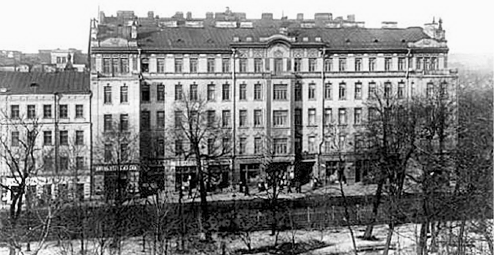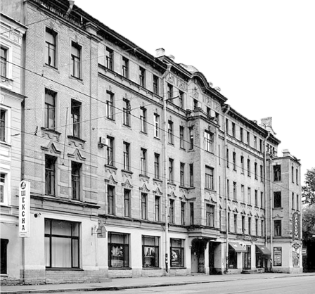 В годы Великой Отечественной войны дом сильно пострадал, от него осталась лишь половина трехэтажного бежевой окраски здания с очень скромной отделкой, которую разнообразят лишь сандрики над окнами второго этажа, обогащенные декоративным орнаментом, и угловой эркер. Сохранившаяся южная часть дома в 1882 г. возведена по проекту архитектора В. В. Штрома[261], а северная, пристроенная в 1906 г. архитектором О. Л. Игнатовичем[262], была разрушена. В списке практикующих врачей за 1905 г. мы встретили имя действительного статского советника, доктора медицины В. Ф. Штрома, отца архитектора[263].