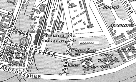 На углу Симбирской и Тихвинской улиц располагалась церковь во имя Происхождения Честных Древ Животворящего Креста Господня (Спасо-Бочаринская), одна из первых на Выборгской стороне. Самая первая временная (полотняная) церковь на этом месте построена еще в 1714 г. и освящена 1 августа того же года в Бочарной слободе «при компанейских домах» у перевоза через Неву по повелению Петра I[264].