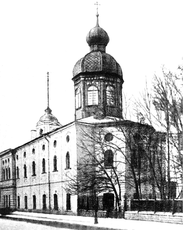 Через тридцать лет после возведения первой деревянной церкви, в 1744–1745 гг., на деньги купцов Дмитрия Лукьянова и Федора Зотова на месте обветшавшего храма по проекту И. Я. Шумахера была возведена новая деревянная церковь, освященная в 1745 г.[272], но и она простояла недолго. Через несколько лет вновь построенное здание опять повредила молния[273]. В 1749–1752 гг. на месте деревянной построили каменную двухэтажную церковь в стиле барокко[274]. Она была освящена 7 февраля 1752 г. – главный престол и два придела во имя Тихвинской иконы Божией Матери и во имя Священномученика Антипы[275]. После расширения 20 июня 1761 г. освятили придел во имя Трех Святителей, а 4 ноября 1767 г. освящена верхняя Спасская церковь[276]. В это время около церкви существовало кладбище.