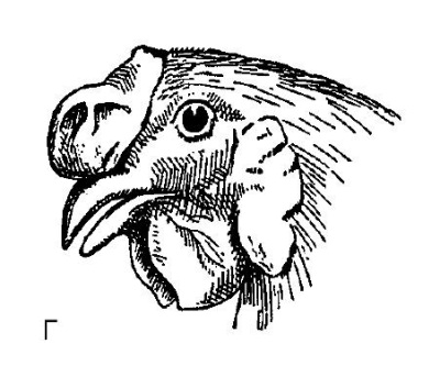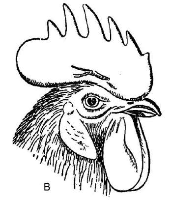 У кур ярко выражен половой диморфизм. Мужские особи отличаются от женских, в первую очередь, ярким оперением, которое особо выделяется на длинном пышном хвосте и шее. У петухов в нижней части плюсны образуются костные выросты – шпоры. И курица, и петух имеют на голове отчетливо различимую бородку и гребень. Они являются органами терморегуляции и позволяют направлять кровоток к коже. В большинстве случаев гребень у петуха больше, чем у курицы. Различают гребни: листовидный (с несколькими зубцами), розовидный, стручковидный, ореховидный и других форм.
