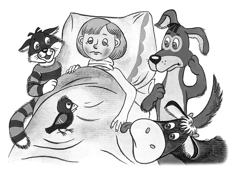 Кот забеспокоился, стал его чаем с вареньем поить. Пёс в магазин побежал, мёд купил. Только дяде Фёдору всё хуже. Лежит он под одеялом, перед ним игрушки и книжки, а он на них и не смотрит. Шарик ушёл на кухню, сел в углу и заплакал. Хочет дяде Фёдору помочь, а не умеет.