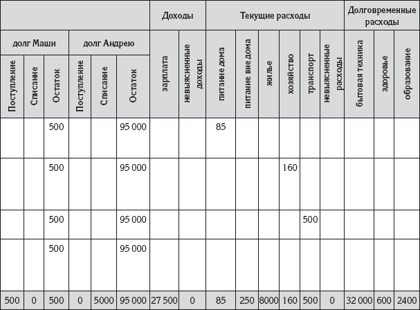 Ирина взяла чистую тетрадь и на ее развороте начертила таблицу. В новой таблице Ирина сохранила столбцы Дата и Комментарий. Столбцы бывших статей двойного назначения – нынешних счетов бухгалтерского учета – Ирина преобразовала в группы столбцов, включив в каждую группу по три столбца с однотипными названиями: Поступление, Списание, Остаток.