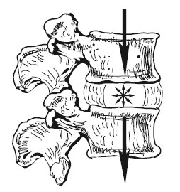 Когда мы поднимаем что-то тяжелое, позвонки начинают «прижиматься» друг к другу, а ядро противостоит этой силе сжатия (рис. 3). Оно уплощается (насколько ему позволяет фиброзное кольцо), теряя при этом некоторое количество жидкости. Но как только нагрузка на позвоночник снижается, ядро начинает активно впитывать воду и восстанавливает прежнюю форму и упругость.
