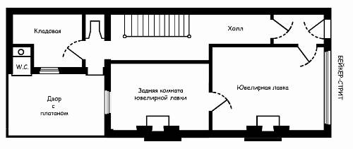 В полностью жилых домах внизу у входа на лестницу обычно вешалась широкая портьера; она отделяла общественную часть холла от частного пространства позади занавеси. В доме 221-б такой портьеры, скорее всего, не было. Более того, не только первый этаж, но и лестница на второй этаж не рассматривались в нашем случае как частная область этого дома. Вспомним «Скандал в Богемии», когда Холмс с Уотсоном ожидают у себя наверху некоего графа фон Крамма, в действительности Его величество короля Богемии.