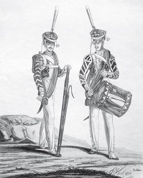 Хор полковой музыки и полковой барабанщик числились в 1-й гренадерской роте, батальонные барабанщики – в тех же ротах, что и батальонные адъютанты. Ротные музыканты, помимо своих основных функций, во время боя выносили раненых, а зачастую выполняли и хозяйственные функции. Полковой и батальонные барабанщики обучали ротных музыкантов и задавали нужный темп движения. В ряде гвардейских полков в 1812 г. были также заведены сверхштатные должности тамбур-мажоров (возможно, они заменяли полковых барабанщиков).