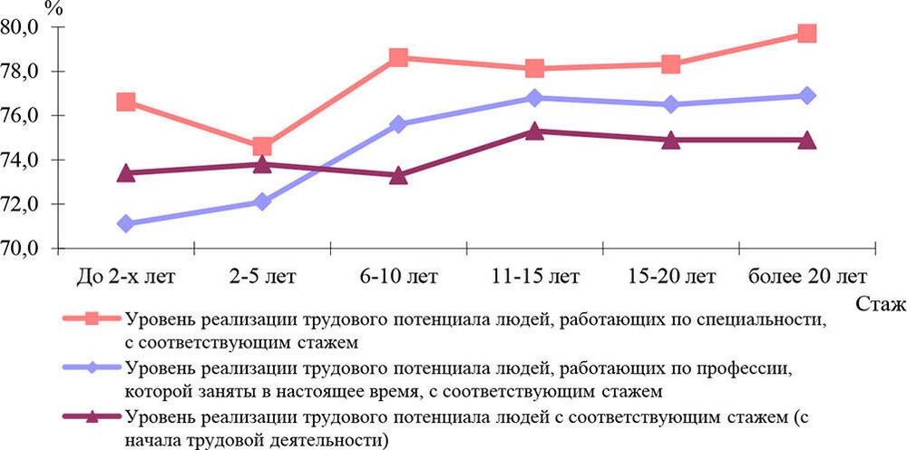 Рис. 2. Зависимость уровня реализации трудового потенциала от стажа работника