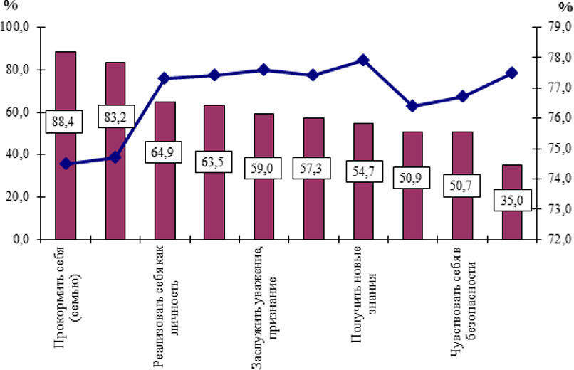 Результаты исследования демонстрируют, что наиболее значимыми мотивами трудовой деятельности населения являются, прежде всего, материальные факторы (прокормить себя (семью) 88 %; заработать денег 83 %; рис. 3). Нематериальные потребности имеют меньшую значимость для населения, как показывают их ответы: реализовать себя как личность стремятся 65 % респондентов; достичь успеха 63 %; получить моральное удовлетворение 57 %; заслужить уважение, признание 59 %, приобрести новые знания 5 %. Наименее значимым мотивом выступает стремление «заслужить любовь» 35 %. [3]