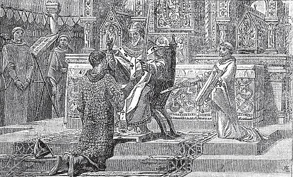 Посвящение в рыцари на поле битвы (со средневековой миниатюры).