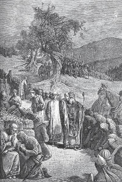 Церковь наполнилась родными и знакомыми вновь посвящаемого. Приехал сам епископ – особенная честь для нашего барона. Сам епископ благословит сегодня меч нового рыцаря. Как богаты, как пестры наряды собравшихся! Каким весельем озарены их лица! Вот понеслись звуки органа; началась месса. Благоговейно выслушал ее вновь посвящаемый, благоговейно приобщился. Наконец наступили торжественные минуты благословения меча. Вновь посвящаемый приблизился к епископу; перевязь с мечом надета у него на шее. Епископ снял меч и громко прочитал следующую молитву: «Пресвятый Господи, Отец всемогущий, Боже вечный, Единый, всем повелевающий и всем располагающий! Чтобы подавлять злобу нечестивых и защищать справедливость, спасительным благоволением Своим Ты дозволил людям пользоваться мечом на земле. Устами святого Иоанна Ты сказал воинам, приходившим искать его в пустыне, чтобы они никого не обижали, не клеветали ни на кого, но довольствовались жалованием своим. Господи! Мы смиренно прибегаем с молитвой к милосердию Твоему. Ты дал рабу Своему Давиду силу победить Голиафа, Иуде Маккавею – восторжествовать над народами, не признававшими Тебя; так же и рабу Своему, сегодня преклоняющему главу свою под ярмо военной службы, сообщи силу и отвагу на защиту веры и справедливости, приумножь в нем веру, надежду и любовь. Дай ему все вкупе – и страх Твой, и любовь Твою, смирение и твердость, послушание и терпение. Устрой все так, дабы ни сим мечом, ни иным он не ранил никого несправедливо, но употреблял его на защиту всего истинного и правого». После этого епископ снова надел на шею молодого рыцаря уже освященный меч со словами: «Прими меч сей во имя Отца и Сына и Святаго Духа, употребляй его на свою защиту и на защиту святой Церкви Божией, на поражение врагов Креста Господня и веры христианской и, насколько возможно это для немощности человеческой, не поражай им несправедливо». Молодой рыцарь, на коленях слушавший как молитву, так и слова епископа, поднялся на ноги, взял свой меч, широко размахнулся им, как бы поражая невидимых врагов Христовой веры, затем отер его о левую руку и снова вложил в ножны. После этого епископ поцеловал нового воина со словами: «Мир тебе». А молодой человек с мечом на шее направился к сеньору своего отца. Это – его восприемник. Молодой человек вручил ему меч. Восприемник спросил его: «С каким намерением желаешь ты вступить в рыцарское общество?» Вновь посвящаемый отвечал ему согласно со словами, которые были произнесены незадолго до того времени епископом. Тут же он принес клятву верности ему как своему сюзерену. Тогда, по приказанию последнего, началось облачение его в рыцарские доспехи. Этим делом занялись рыцари, им помогали дамы и молодые девушки. Сперва прикрепили ему левую шпору, затем правую, надели кольчугу, а после всего опоясали его мечом. Когда новый рыцарь был облачен в доспехи (adoubeґ), он скромно опустился на колени перед своим восприемником. Тогда последний поднялся со своего места и своим обнаженным мечом, держа его плашмя, три раза коснулся плеча вновь посвященного, произнося при этом: «Во имя Божие, во имя святого Михаила и святого Георгия я делаю тебя рыцарем, будь храбр и честен». После этого молодому рыцарю поднесли шлем, щит и копье. Сопровождаемый всеми присутствующими в храме, он вышел из него. Собравшийся перед це
