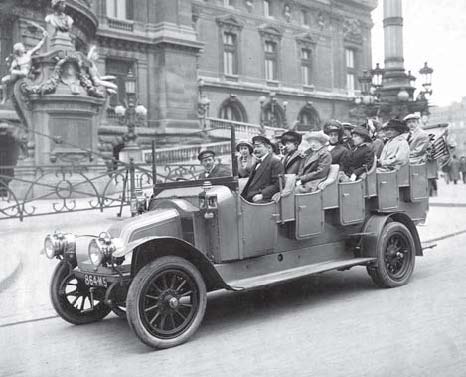 Туристы в прогулочных костюмах в отрытом шарабане, Париж, 1910-е гг.