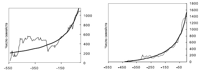 Рост разнообразия семейств морских (слева) и континентальных (справа) животных и растений в течение фанерозойского зона (последние 542 млн лет истории Земли). По горизонтальной оси – время в млн лет назад. Толстой линией показан гиперболический тренд. Из статьи: Марков А. В., Коротаев А. В. Гиперболический рост разнообразия морской и континентальной биот фанерозоя и эволюция сообществ. 2008. //Журнал общей биологии. 2008. № 3.