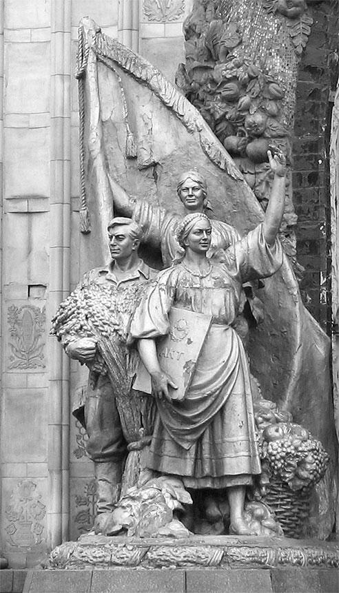 Скульптурная группа «Сельское хозяйство». Скульпторы Е. И. Белостоцкий, Г. Л. Пивоваров, Ю. М. Фридман (1939). Павильон 58 «Украина»