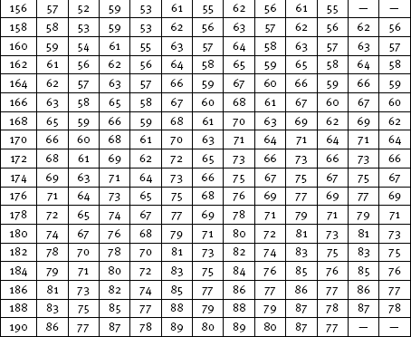 Я представляю таблицу отдельно для мужчин и женщин для определения здорового веса исходя из роста. Конечно, бывают исключения, и я вернусь еще к этому, но для большинства людей эти значения верны. Вес в середине значений и есть идеал, к которому надо стремиться.
