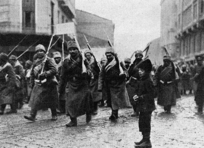 На стенах казарм в Львове изображены формы одежды австрийских войск. Пленные австрийцы дают объяснения их русскому офицеру