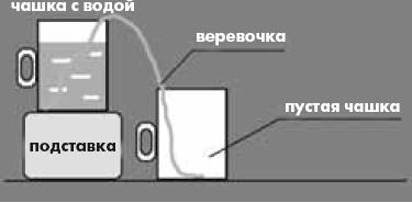 Проведем старинный опыт, описанный во многих книжках, и тем не менее очень интересный. Возьмите две чашки и кусочек обычной веревки сантиметров десять длиной. Веревка должна быть хлопчатобумажной. Промойте веревочку с мылом в теплой воде, чтобы удалить частицы жира из капилляров – ведь иначе вода не будет по ним проходить. Теперь поставьте чашку с водой на подставку (например, перевернутая ваза), а пустую чашку – ниже нее, на стол. Перекиньте мокрую веревочку из одной чашки в другую как мостик и оставьте на ночь. Только веревочка не должна провисать петлей между чашками, а должна ровно спускаться вниз.