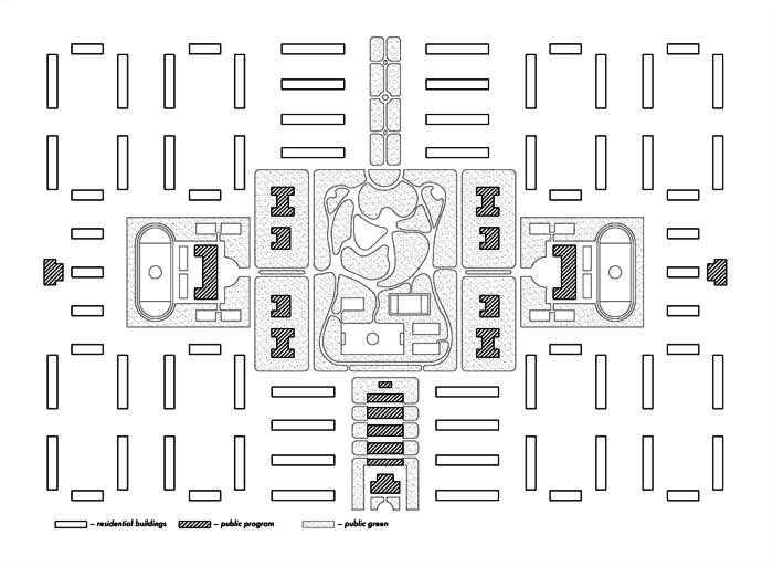 Образцовая планировка района из пособия для архитекторов 1960-х годов. Блоки жилых строений размещаются на равных расстояниях от объектов социального значения и озелененных территорий