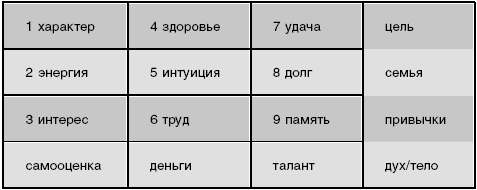 Теперь к уже существующему квадрату добавим подсчет количества цифр в каждом ряду и по диагонали. Самооценка – это количество цифр в графе характер + энергия + интерес. Деньги – это количество цифр в графе здоровье + интуиция + труд. Талант – удача + долг + память. Цель – характер + здоровье + удача. Семья – энергия + интуиция + долг. Привычки – интерес + труд + память.