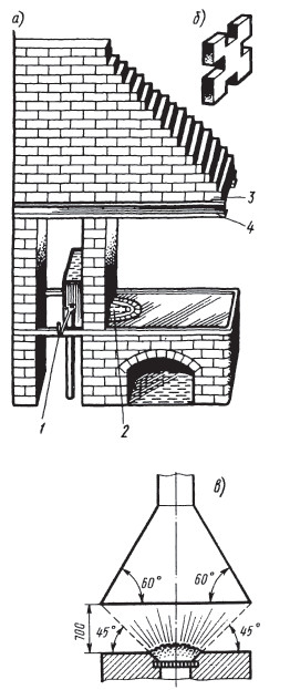 Для лучшего улавливания дыма и газов зонты устанавливают над горном на высоте 400–800 мм, а точная высота уже определяется на месте в зависимости от индивидуальных особенностей горна (рис. 1.1.4 в) – силы дутья, высоты и размеров вытяжной трубы и других параметров. В некоторых случаях зонты оснащаются опускающимися крыльями. Недостаток металлических зонтов в том, что они могут прогореть, а ремонт их сложен и трудоемок. Наиболее долговечны зонты, сложенные из обычного или огнеупорного кирпича. Однако такие зонты значительно тяжелее металлических, и для их поддержки необходима жестко заделанная металлическая рама из уголков или швеллеров, а иногда и дополнительные подпорки по углам.