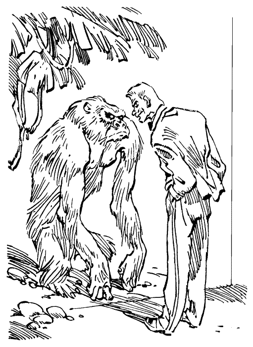 Двухметровая горилла показалась из леса и раскачивающейся походкой, опираясь одной рукой о землю, направилась к человеку. Спокойно и меланхолично подошла горилла к стеклу, выпрямилась во весь гигантский рост, остановилась, чуть заметно покачиваясь из стороны в сторону. Фон Круг снял очки, приблизил лицо к стеклу, сквозь которое отчетливо видна была волосатая, с вывернутыми ноздрями и глубоко запавшими глазницами, безобразная морда. С минуту они смотрели друг другу в глаза…
