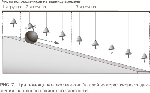 В частности, Галилей проводил эксперименты с наклонными плоскостями – наклоненными ровными поверхностями, которые так часто встречаются, раздражая учащихся, в любом начальном курсе физики. Для Галилея наклонная плоскость не была всего лишь надуманной школьной задачей, каковой она иногда кажется школьникам. Это был способ изучить скорость падающих тел: ведь если «растянуть» спуск объекта на некоторое горизонтальное расстояние, можно будет точно измерить, как он «падает». Время он измерял при помощи водяного хронометра; но этого мало: Галилей придумал хитроумную систему колокольчиков, развешанных на определенных расстояниях друг от друга, и мог определять скорость катящегося вниз шарика на слух (рис. 7), а слух у него был отличный. При помощи этого и других экспериментов в области движения и силы тяжести Галилей вместе с Иоганном Кеплером и Рене Декартом подготовил фундамент для законов классической механики, которые развил Исаак Ньютон.