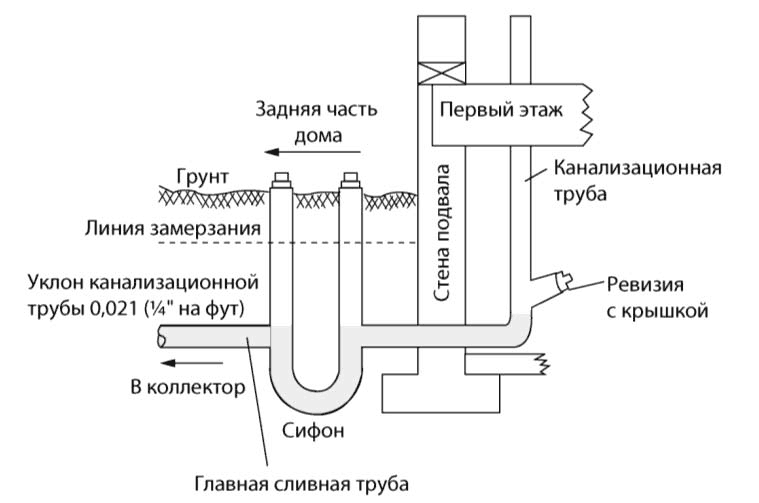 Обязателен монтаж главной подводящей трубы и коллектора сточных вод (рис. 1.2). Обратите внимание на расположение как подводящей, так и сливной (канализационной) труб. Они обязательно должны быть расположены ниже уровня промерзания почвы (грунта). По обеим трубам поступает вода, поэтому вне помещения они могут замерзать.