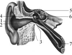 1 – ушная раковина; 2 – наружный слуховой проход; 3 – барабанная перепонка; 4 – среднее ухо; 5 – полукружные каналы костного лабиринта; 6 – улитка; 7 – слуховая труба.