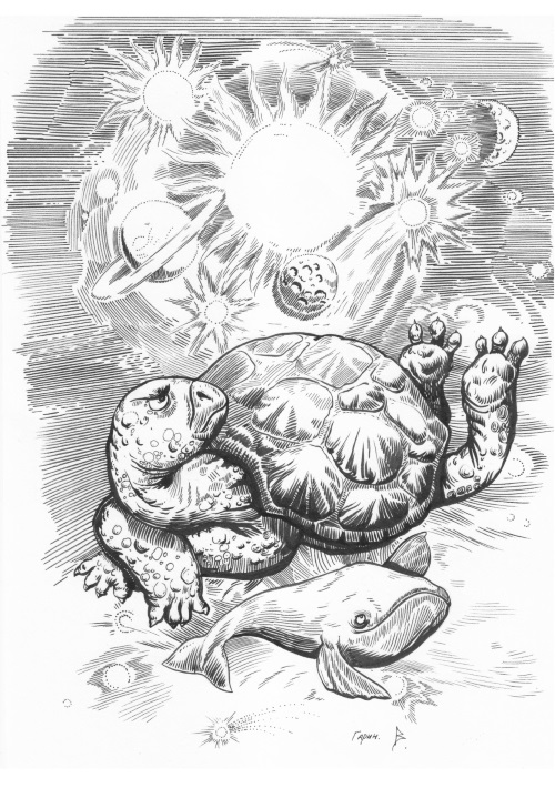 Ответ на второй вопрос – о строении мира – менялся от века к веку. Люди раннего Средневековья часто представляли себе мир в виде плоского блина суши, накрытого хрустальным куполом небес с дырочками-звёздами. На чём стоял этот блин? Ответов было немало. Кто-то считал, что он плавал в океане, кто-то – что он покоился на спинах трёх слонов. На чём же стояли эти слоны? Возникла идея, что слоны стояли на спине черепахи-гиганта. Что может быть прочнее и надёжнее, чем твёрдый панцирь исполинской морской черепахи? – решили люди, ещё не знавшие паровых машин и электричества. Вот так и получилось, что в один прекрасный день Гигантская Черепаха проснулась от неожиданного груза на спине.