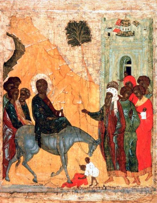 За несколько дней до Своих крестных страданий Христос отправился в Иерусалим для празднования Пасхи. Он въехал в город на молодом осле, что для иудейского народа было символично: по древнему обычаю именно на осле въезжали в город цари-победители, а в военные походы отправлялись на коне.