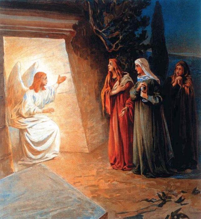 Жены-мироносицы понимали, что фарисеи и первосвященники, отдавшие Христа на распятие, будут и после Его смерти преследовать тех, кто остался Ему верен. Но это их не пугало, беспокоились они только о том, как войти внутрь погребальной пещеры, вход в которую был запечатан огромным камнем. Подойдя ближе, женщины увидели, что вход в пещеру открыт, а на отваленном от гроба камне сидит Ангел в белоснежной одежде. Вот как описывает это евангелист Марк: «Он же говорит им: не ужасайтесь. Иисуса ищете Назарянина, распятого; он воскрес, Его здесь нет. Вот место, где Он был положен» (Мк. 16, 6). Так за свою преданность и решимость мироносицы первыми из людей узнали из уст Ангела о Воскресении Христа и принесли эту радостную весть апостолам.