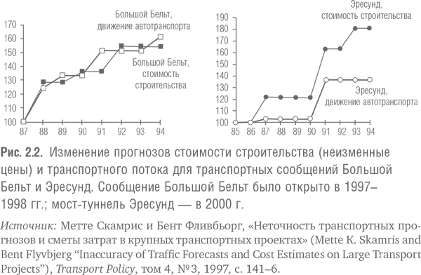В этой и следующих главах мы рассматриваем опыт множества мегапроектов, включая туннель под Ла-Маншем и транспортные сообщения через проливы Большой Бельт и Эресунд. Стоимость последних трех оценивается во многие миллиарды долларов. И хотя мы подвергаем эти проекты придирчивому анализу, наша цель состоит вовсе не в их критике, даже в случаях имеющихся недоработок, а в конструктивном изучении и извлечении уроков, которые могут оказаться полезными для более качественного принятия решений по мегапроектам в будущем. Учитывая, какие огромные суммы денег затрачены на крупнейшие транспортные инфраструктурные проекты, удивительно, насколько незначительны доступные данные и исследования, которые помогли бы ответить на два основных вопроса: (1) привели ли такие проекты к предполагаемым результатам; и (2) какова фактическая жизнеспособность таких проектов в сравнении с проектируемой. Поэтому, кроме транспортных проектов, мы сочли целесообразным рассмотреть данные и исследования других типов инфраструктурных проектов и сравнить опыт этих проектов с опытом транспортного сектора. Таким образом, мы рассмотрим данные нескольких сотен больших проектов. В этой главе мы остановимся на стоимости мегапроектов. В главах 3 и 4 мы рассмотрим спрос на такие проекты и их жизнеспособность.